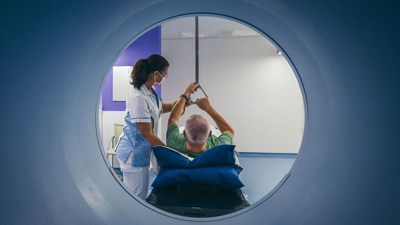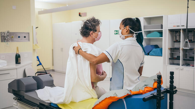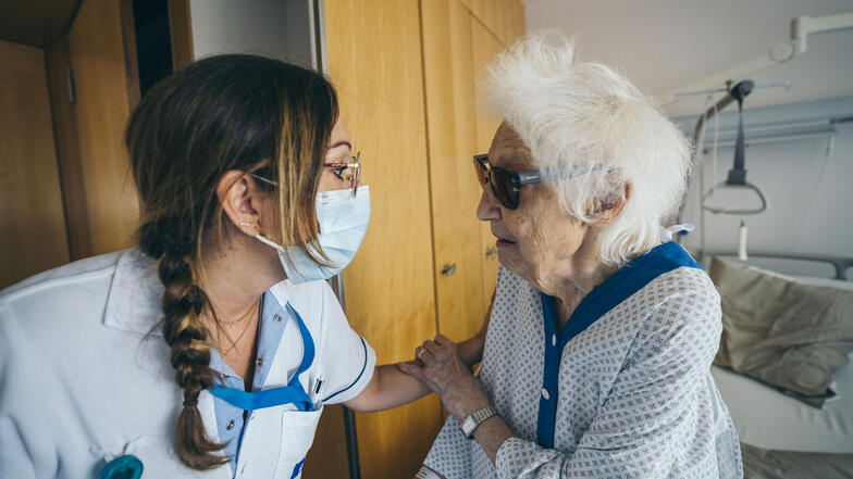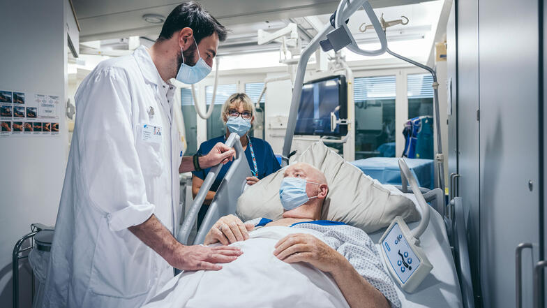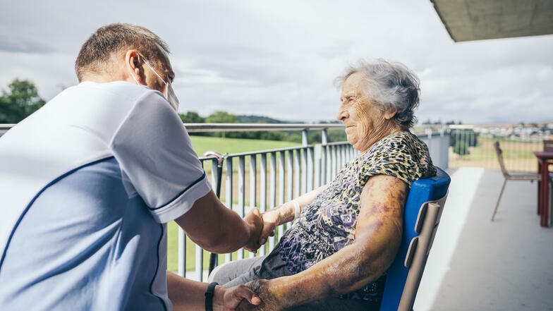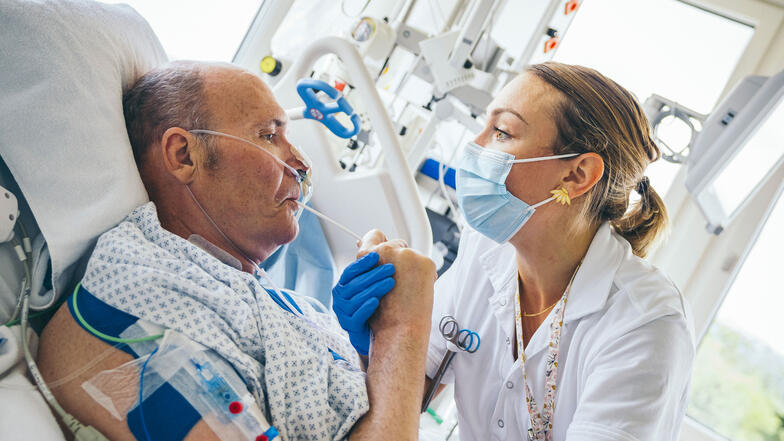 La connivence entre patient et soignant va jusqu'au mimétisme de la couleur du masque de protection ! © Jo Bersier