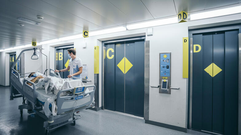 Discussion entre un patient et la personne chargée de son transport, en attendant l'ascenseur. © Jo Bersier