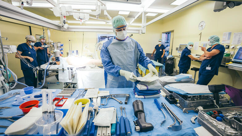 Dernière vérification de la longue liste des instruments et du matériel, avant une opération de la hanche. © Jo Bersier