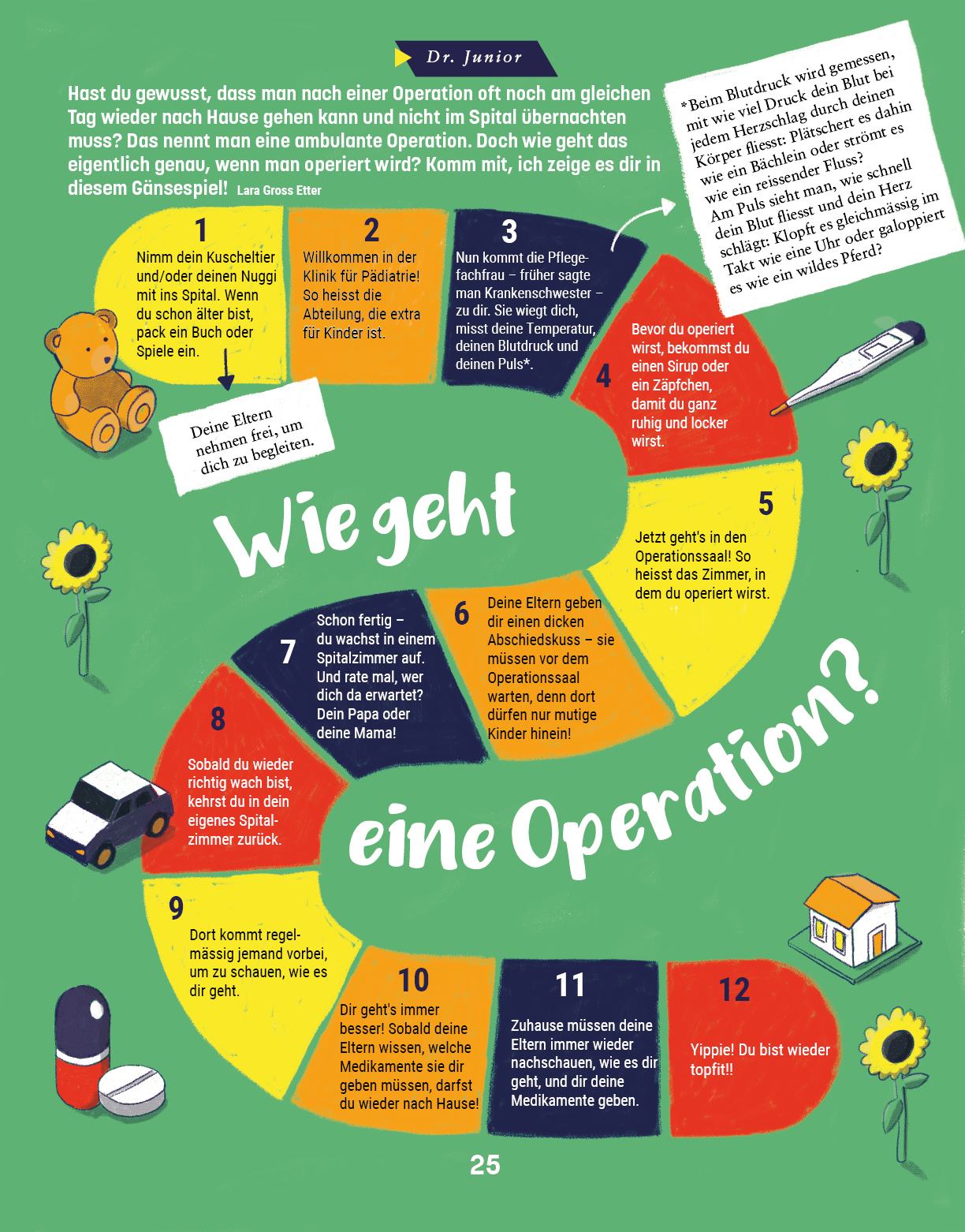 Hast du gewusst, dass man nach einer Operation oft noch am gleichen Tag wieder nach Hause gehen kann und nicht im Spital übernachten muss? Das nennt man eine ambulante Operation. Doch wie geht das eigentlich genau, wenn man operiert wird?